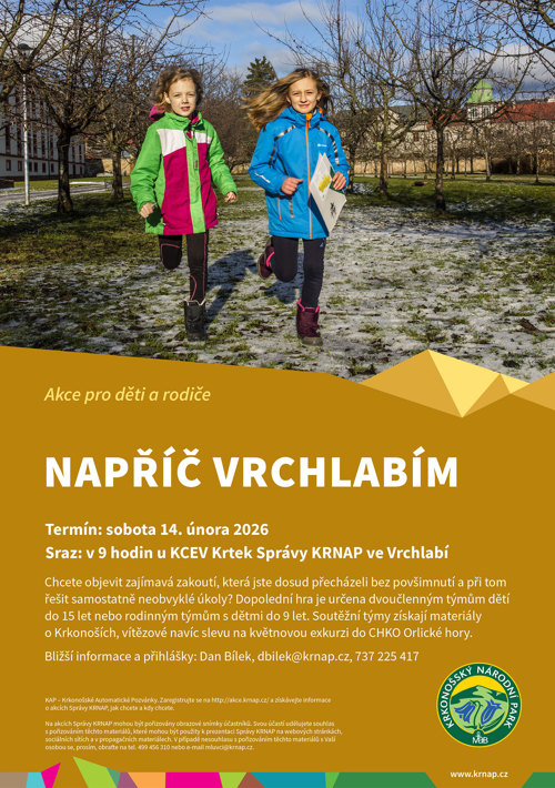 Chcete objevit zajímavá zákoutí, která jste dosud přecházeli bez povšimnutí a při tom řešit samostatně neobvyklé úkoly? Naše dopolední hra je vypsána pro dvoučlenné týmy dětí do 15 let, případně pro rodinné týmy s dětmi do 9 let. Soutěžní týmy získají krásné materiály o Krkonoších a vítězný tým dokonce slevu na květnovou exkurzi do CHKO Orlické hory.