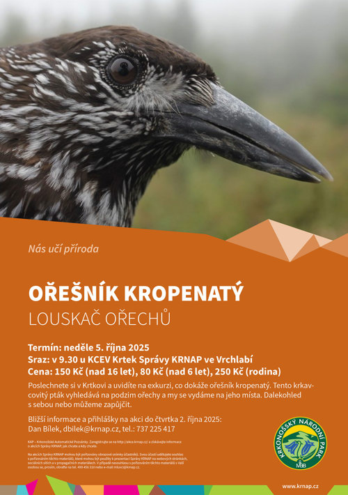 Poslechnete si v Krtkovi a uvidíte na exkurzi, co dokáže ořešník kropenatý. Tento krkavcovitý pták vyhledává na podzim ořechy a my se vydáme na jeho místa. Dalekohled s sebou nebo můžeme zapůjčit