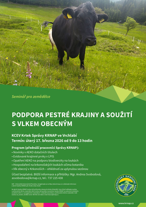 Správa KRNAP zve zemědělce hospodařící na území Krkonošského národního parku a jeho ochranného pásma na seminář věnovaný tématu podpory diverzity v krajině a soužití s vlkem obecným.