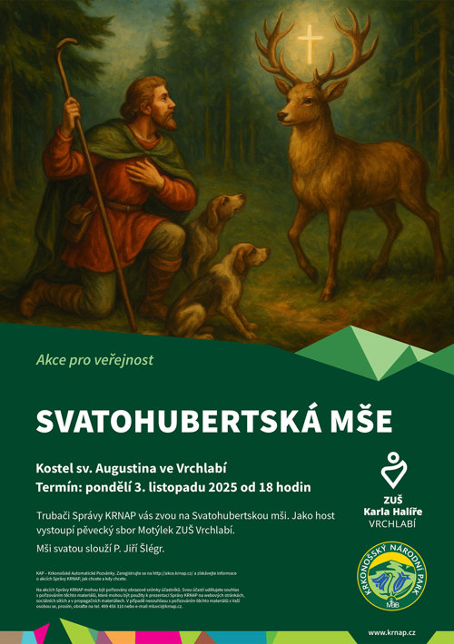 Trubači Správy KRNAP vás zvou na Svatohubertskou mši. Jako host vystoupí pěvecký sbor Motýlek ZUŠ Vrchlabí. Mši svatou slouží P. Jiří Šlégr.