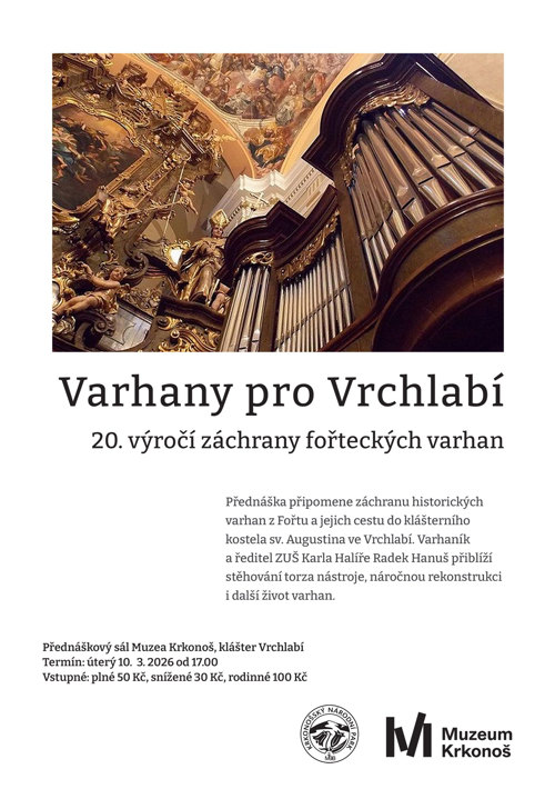 Přednáška připomene dvacet let od zahájení záchrany historických fořteckých varhan a jejich cestu do klášterního kostela sv. Augustina ve Vrchlabí. Radek Hanuš, varhaník a ředitel vrchlabské Základní umělecké školy Karla Halíře, vám přiblíží příběh stěhování torza nástroje, náročnou rekonstrukci i další život varhan až do současnosti.