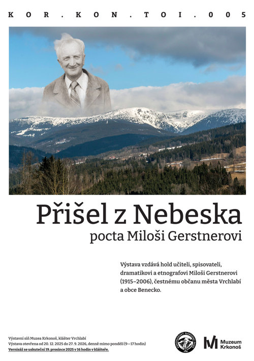 Přijměte pozvání na vernisáž výstavy, která vzdává hold učiteli, spisovateli, dramatikovi a etnografovi Miloši Gerstnerovi (1915–2006), čestnému občanu města Vrchlabí a obce Benecko.