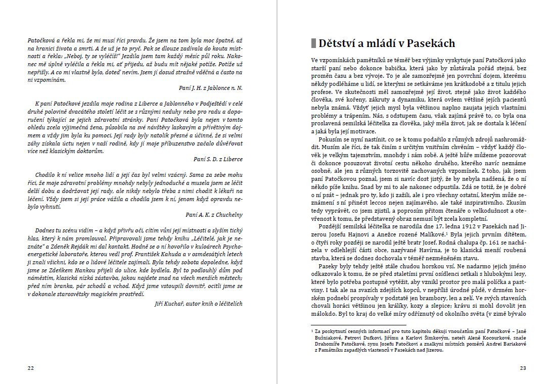 Autor knihy Tomáš Chvátal: „Věnujeme se širokému období od 17. století až přibližně po rok 2000. V knize najdeme informace mimo jiné o sběru bylin v Krkonoších, životě bab kořenářek. Základem jsou však osudy jednotlivých léčitelských osobností. Troufám si říci, že i díky vydatné pomoci spoluautora Ivo Navrátila snad u každého léčitele přináší publikace leccos nového, v mnoha případech dokonce objevuje lidi, kteří neprávem upadli v zapomnění. Text doplňují četné fotografie a recepty, jen sbírka receptů paní Patočkové čítá téměř 50 stran.“